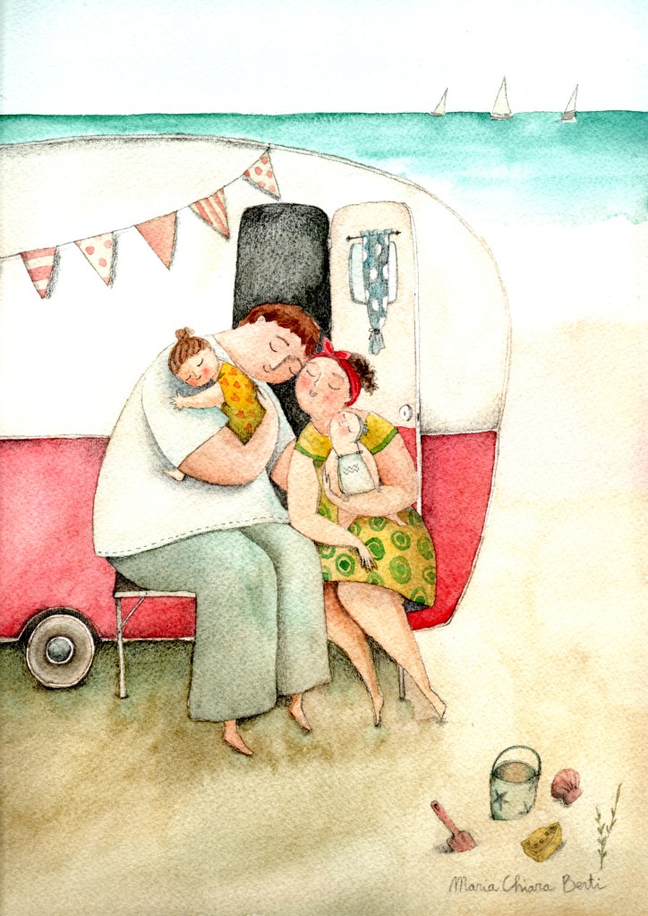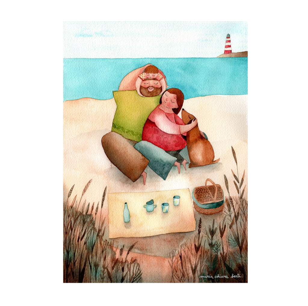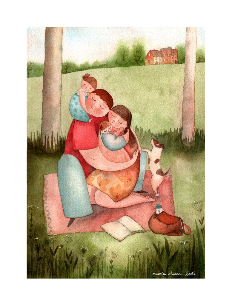 Illustrazioni ad acquerello di abbracci, baci e coccole